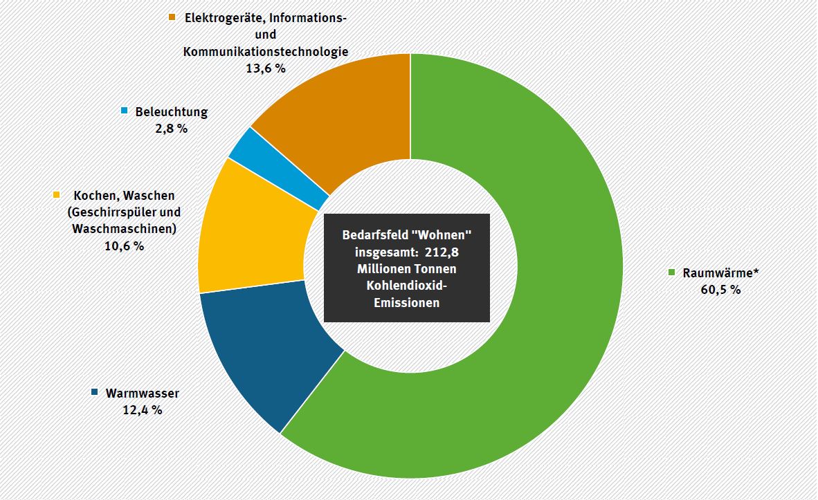 Beim Wohnen fallen sogenannte direkte und indirekte CO2-Emissionen an. Direkte Emissionen entstehen durch den unmittelbaren Einsatz von Energie für Heizen und Warmwasserbereitung, indirekte Emissionen bei der Energiebereitstellung, zum Beispiel für Stromverbrauch bei der Nutzung von Haushaltsgeräten. Anteilig verteilen sich die CO2-Emissionen folgendermaßen: