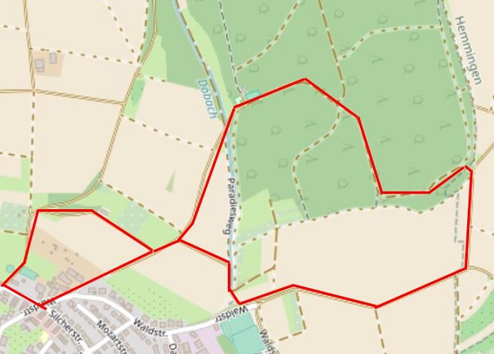...und zwar auf dieser Strecke V | Wir haben an der Wendeplatte Daimlerstr./Waldstraße begonnen und sind dann weiter die Waldstraße runter am Bolzplatz entlang und abgebogen Richtung Waldkindi. Dann ging’s weiter über das Verlobungswegle zum Waldspieli. Von dort am Bächle entlang Richtung Wald und über den Berg Richtung Martinshof. Am Martinshof sind wir an der Ecke Silcherstraße wieder die Waldstraße runter Richtung Ausgangspunkt Wendeplatte. Erschreckend waren die Massen an Hundetüten mit Inhalt die wir aufgesammelt haben. Und Masken, Masken... :( ingesamt kam eine ordentliche Tüte Müll zusammen, die daheim in die Tonne wanderte!