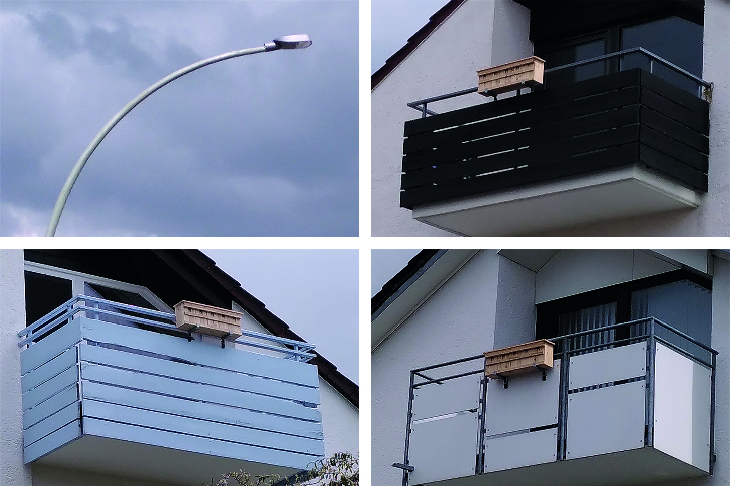Mai 2021: Mangels Nistmöglichkeiten in den neuen Straßenlaternen können Spatzen in der Silcherstraße jetzt in drei neuen Spatzenhotels brüten.