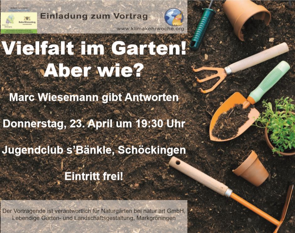 Die Klima-Kehrwoche hat am 19. Mai 2020 die Schöckinger Gärten auf ihre biologische Vielfalt untersucht. Hierfür waren fünf Gartenfachleute im Dorf unterwegs: Wolfgang Köhrer, der ehemalige Vorsitzende des Schöckinger Obst- und Gartenbauvereins, Tobias Kemper, Spezialist für naturnahe Gärten bei Schwenk Baumpflege, Frieder Weigand von der Firma natur art, Verena Merkle von der Firma Grün und mehr und Helge Gumpert, Dipl. FH Landespflege.